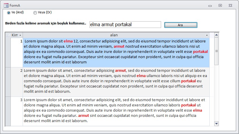 Burada amaç arama kutusuna girilen birden fazla anahtar kelimenin geçtiği kayıtları filtrelemek.. Tek koşulumuz var; kelimeler arasında boşluk bırakmak.. Tabi tek bir kelime de ara