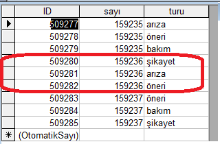 kayıt_no alanına yazılan 159236 nolu kayda ait arıza varmı diye KAYITLAR tablosundaki SAYI alanında aratmam gerekiyor.