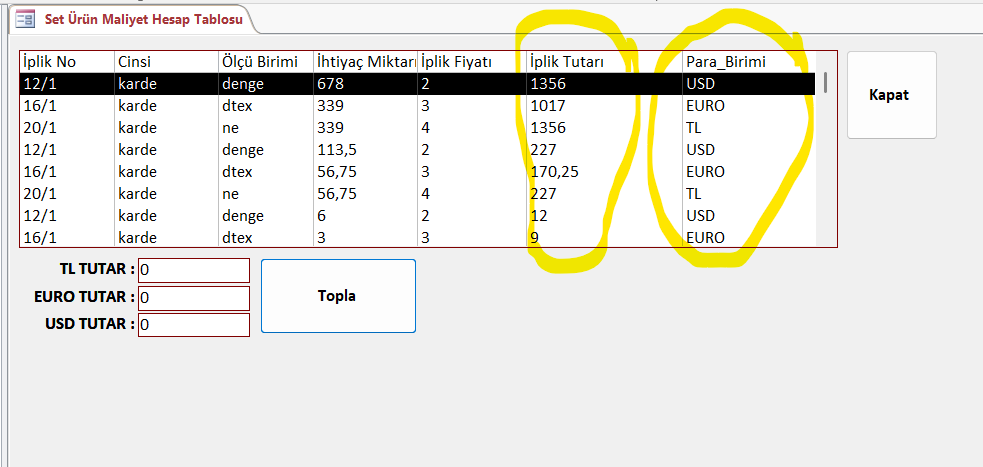 eklediğim örnekteki liste kutusundaki İPLİK TUTARI verilerini para birimine göre toplatıp ,