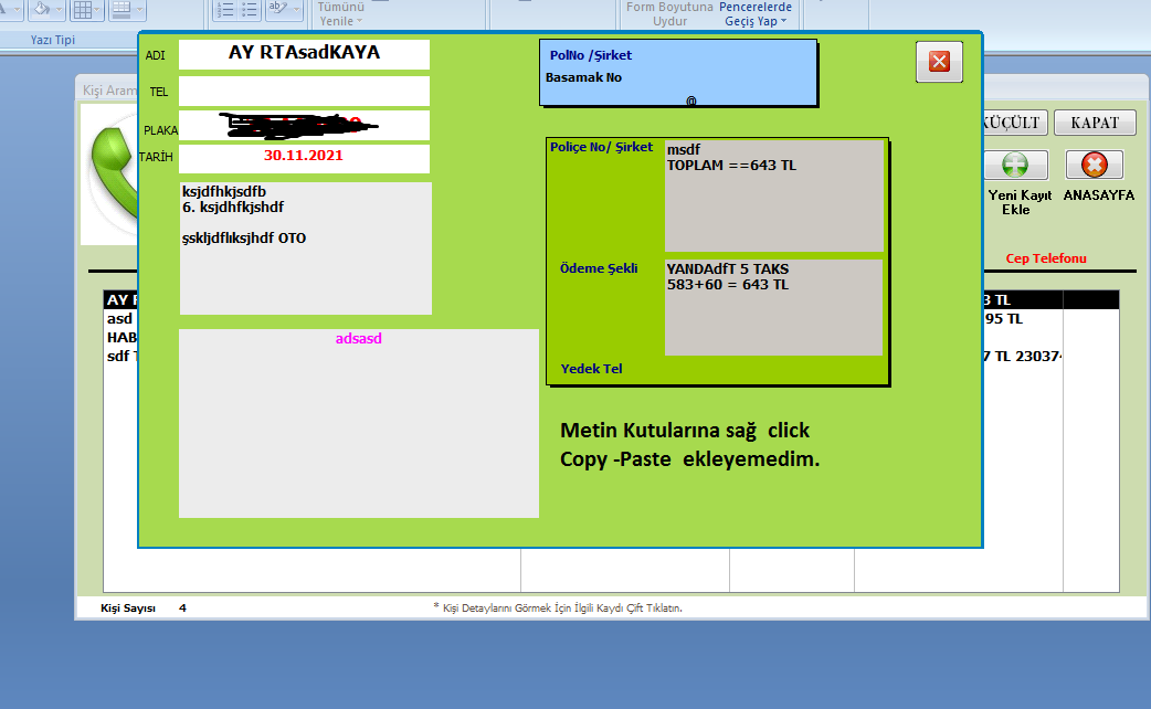 Ayrıntılar formu üzerinde plaka metin kutusuna uyguladım, diğerlerine de siz uygulayabilirsiniz. SağMenuEkle adında bir modül ekledim. Bu modülün adını yerleştirmek istediğiniz metin kutularının Kısayol Menüsüne atayacaksınız.