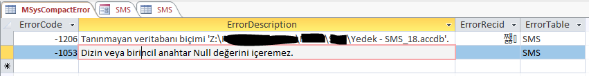 Access Error -1206 ve -1053 hatası veriyor.