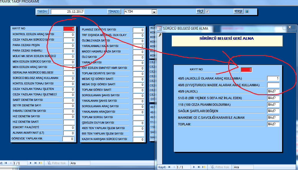Hocam geri alınan sürücü belgesi hanesi güncelleme sonrası gerekli alanları doldurmak için bir sayfa açılıyor. 48/5-48/8 vb. verileri dolduruyorum Verilerin hepsi Günlükfaaliyet tablosu içerisinde toplanıyor yeni açılan sayfadaki verilerin hepsi aynı tablonun aynı hanesinde olması gerekirken bir alt satıra atıyor.