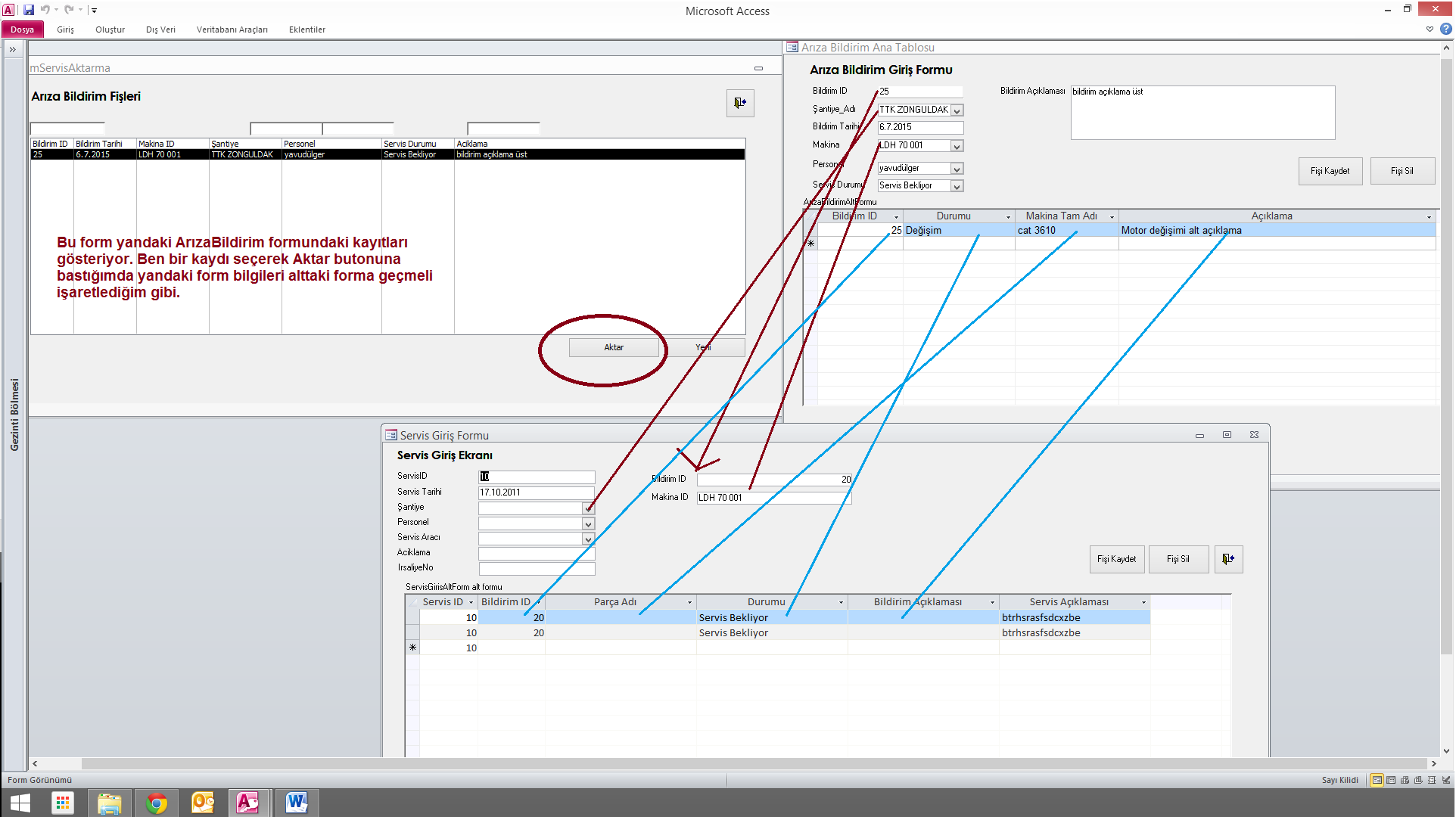 Şu şekilde bir kodlama yapıldı ama aktarma tam yapılmıyor, üst formlar asında iletişim kuruyor ama alt formlar aktarma yapamıyor. Aktar Butonunun Tıklanma olay yordamına aşağıdaki kodlama yapıldı: