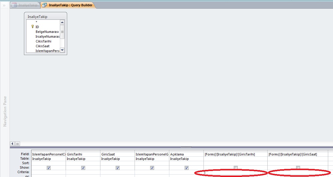 Yapmak istediğim bu forma bir sorgu ekleyip İrsaliye Giriş tarihi boş olanları bir listboxa yazdırmak. Bunun için bir iki şey denedim fakat olmadı. Aşağıda sorgunun tasarım görünümünün bir halini ekledim. Criteria Kısmına ne yazmalıyım ki sadece giriş tarihi veri sütünu boş olanları listelesin.