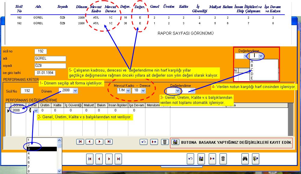 çalışananın 2008 yılı Kadrosu, Derecesi ve Değerlendirme(harf) notu farklı girilmesine rağmen 2009 yılı ile aynı görünüyor. Yani 2009 yılının bilgilerini 2008 üzerine yazıyor.