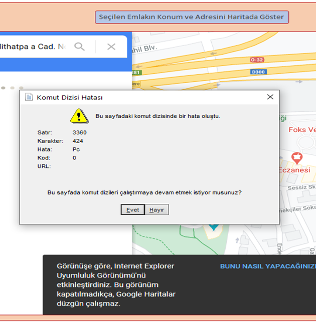 Aşağıda resmini gönderdiğim form üzerinde bir binanın adresini görüntülemek istiyorum. Bu konuda sitemizden aldığım "Form_Üzerinden_ google_maps_Yer_Bulma_2007"uygulamasından faydalandım ve kendi uygulamama entegre etmeye çalıştım. Form üzerinde adres açılıyor ancak resimde görünen hata mesajları çıkıyor bu konuyu nasıl çözebilirim. Yardım aldığım uygulamayı da açsam aynı mesajları alıyorum. İnternet explorer hatası diyor talimatı takip ettim ama talimatta belirtilen konuları Microsoft Edge üzerinde bulamadım. yardıma ihtiyacım var. Teşekkür ederim.