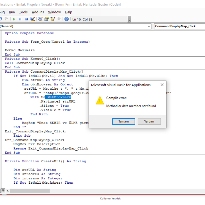 5. strURL = Me.ulke & ", " & Me.il