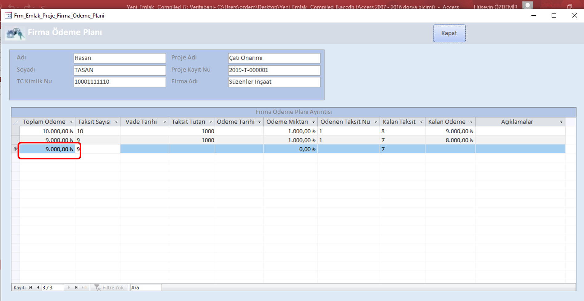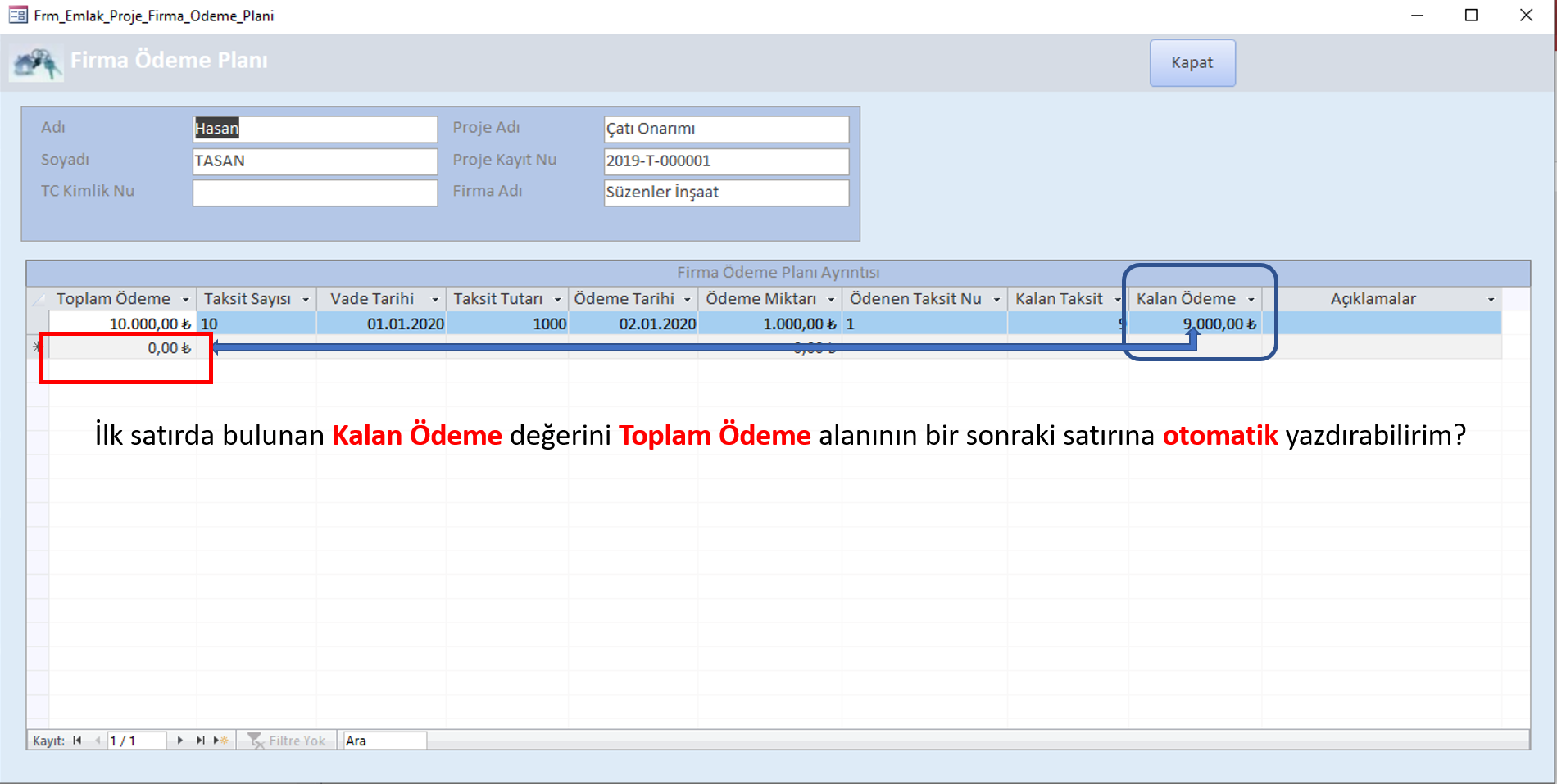Veritabanımda "Frm_Emlak_Proje_Firma_Odeme_Plani" adlı bir ana formum ve buna bağlı "AltForm_Firma_Odeme_Plani" adlı altformum var.