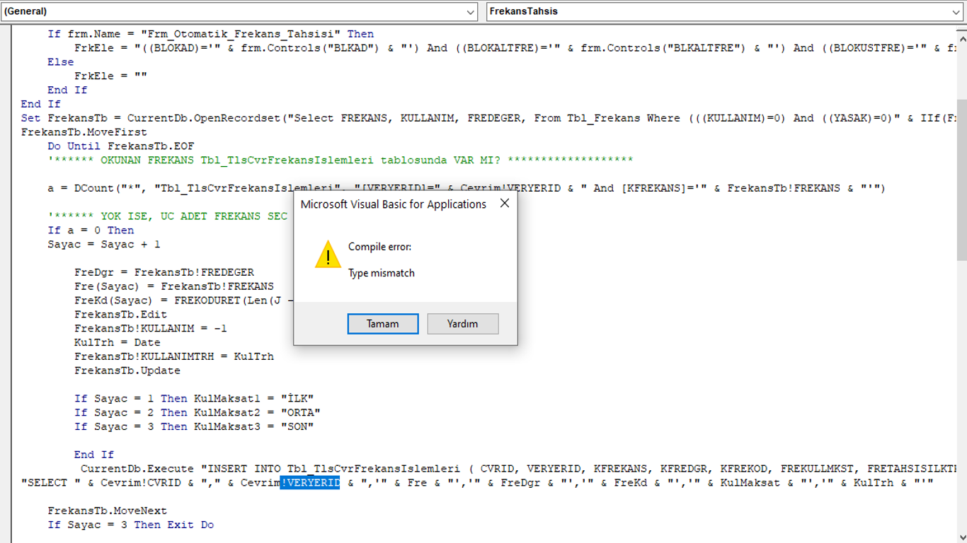 Ben de yeni düşünceme uygun olarak “Tbl_TlsCvrFrekansIslemleri” tablosu üzerinde değişiklik yaptım ve (TEMASFRE, FREDGRT, FREKODT), (ESASFRE, ESASFREDGR, ESASFREKOD), (YEDEKFRE, YEDEKFREDGR, YEDEKFREKOD) 3’lü grup alanları ile TAHSISTRH alanını silerek yerlerine tek bir frekans alanı olan KFREKANS, KFREDGR, KFREKOD alanlarını, frekansın ne maksatla kullanılacağını (TEMAS, ESAS ve YEDEK) belirlemek için FREKULLMKST alanını, frekansın tahsis edildiği tarihi yazmak için FRETAHSISILKTRH, frekansın tahsisinin sona erdiği tarihi yazmak için FRETAHSISSONTRH ve en son olarak da frekansın tahsis numarasını yazmak için FRETAHSISNU alanlarını “Tbl_TlsCvrFrekansIslemleri” tablosuna ekledim. Ancak FRETAHSISILKTRH, FRETAHSISSONTRH ve FRETAHSISNU alanları için henüz herhangi bir prosedür oluşturmadım, onlarla daha sonra ilgileneceğim. Yeni düzenlediğim “Tbl_TlsCvrFrekansIslemleri” ve öncesinde kullandığım “Tbl_TlsCvrFrekansIslemleriEski” tabloları ekteki örnekte mevcuttur. Yeni duruma göre manuel olarak frekans tahsis işlemlerini sorunsuz olarak hallettim. Ama otomatik tahsis işlemlerinde takıldım kaldım. Elimde mevcut olan MODÜL üzerinde bilgilerim dahilinde oynamalar yaptım ama maalesef her denememde TYPE MISMATCH hatası aldım özellikle VERYERID için. Hata mesajının ekran görüntüsü de örnekte eklidir.