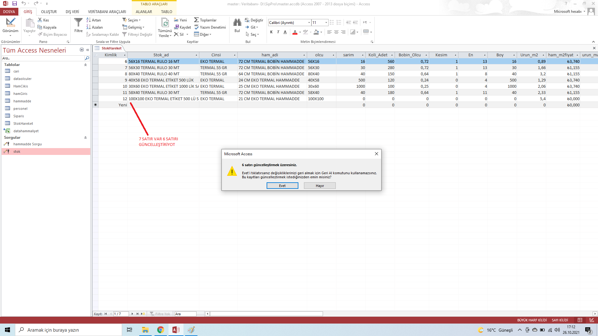 uygulamanız bağlı tablo olmadığı için düzgün çalışmıyor. Hata resminde 6 satır güncelleniyor demişsiniz. Büyük ihtimalle stok sorgusunda kullandığınız kriterlerin birinden veya birkaçından kaynaklanıyor olabilir, dikkatlice kontrol edin, gözden kaçırdığınız bir nokta olabilir.