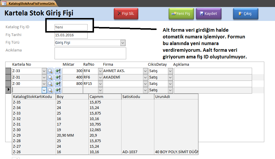 Ekte resimde görülen formumda alt forma veri girdiğim halde üst formda Katalog Fiş ID kısmına yeni numara verdiremiyorum. Nasıl yeni ID verdirebilirim.