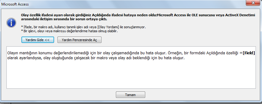 formun açıldığında ve yüklendiğinde olaylarına ya da başka yerlere giriş yapıp kodsuz sadece açıklama yazsam bile olayın tanınmadığını bildirip hata veriyor. tüm nesneleri başka vt'ye aktardım yine devam ediyor. yeni oluşturduğum formlarında eskilerinin de yaklşaık yarısında aynı sorun var. ole sunucusyla arasında hatadan bahsedip ilgili olayın tanımlanamdığını ya da işlevin değerlendirilemediğini bildiriyor.