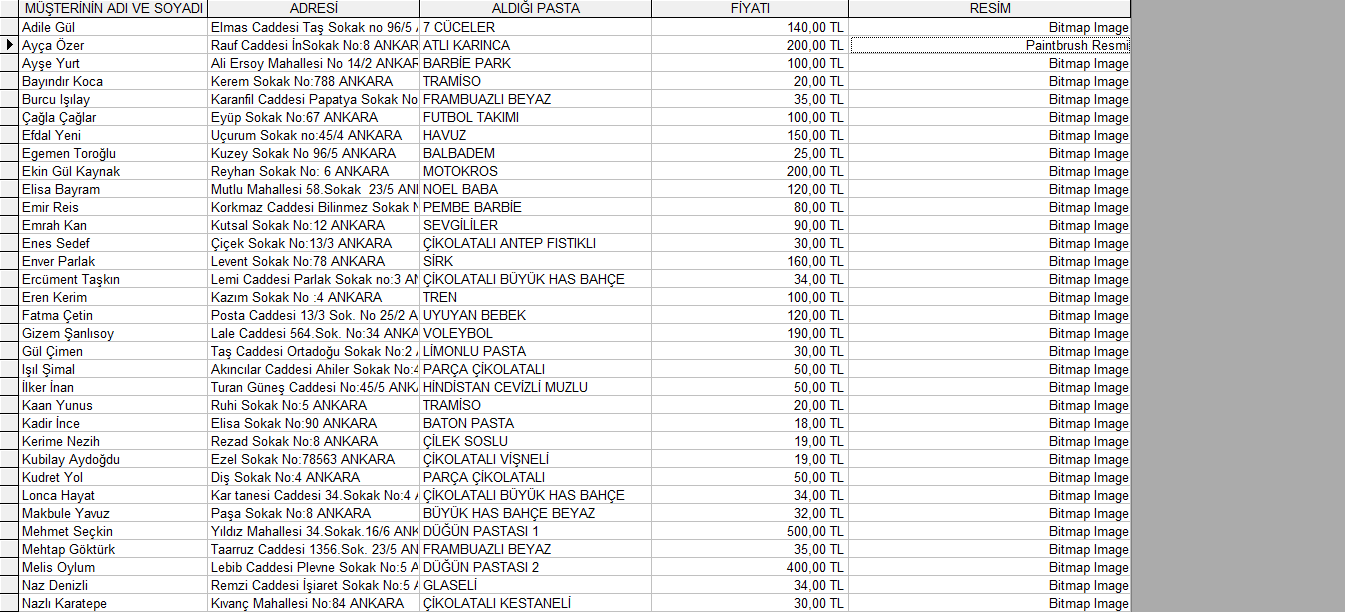işlemler tablosunda kişinin aldığı pastaya göre fiyat ve o pastanın resmini tekrar ekledim
