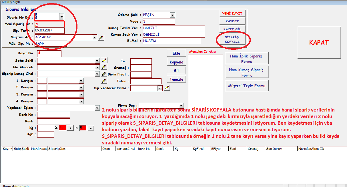 örneğin 2 nolu siparişe ait verileri girdikten sonrak SİPARİŞ KOPYALA butonuna bastığımda bana hangi siparişe ait verilerin kopyalanacağını soruyor, ben burada 1 yazınca bana 1 nolu siparişteki verileri 2 nolu sipariş olarak S_SIPARIS_DETAY_BILGILERI tablosuna kaydediyor,